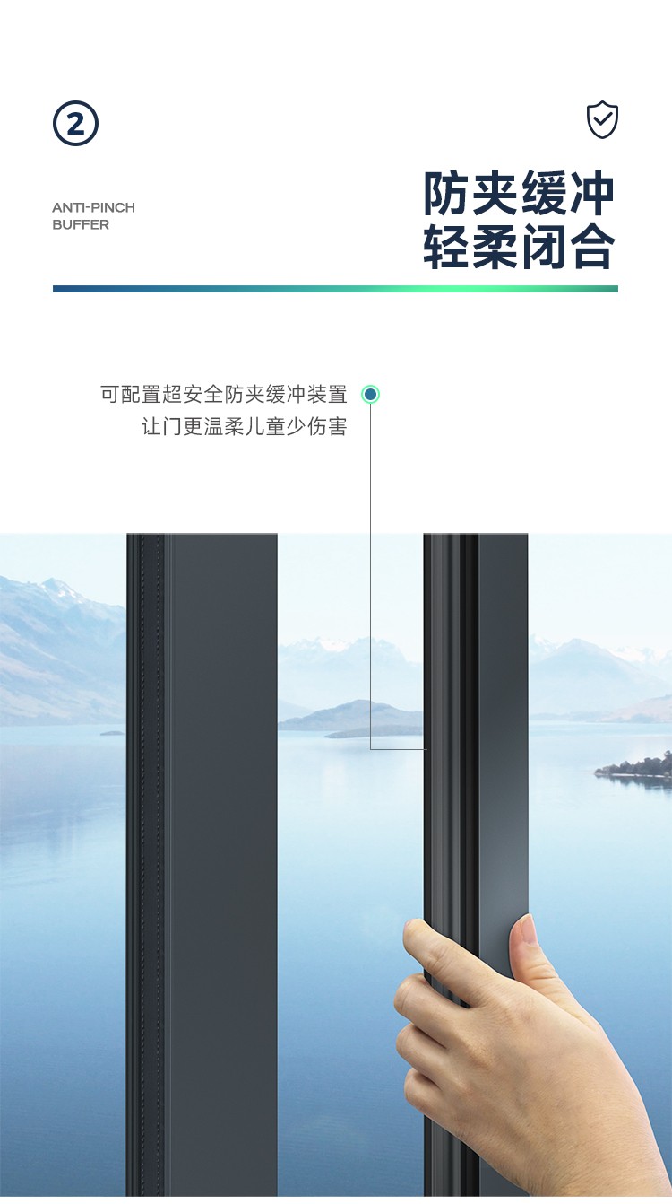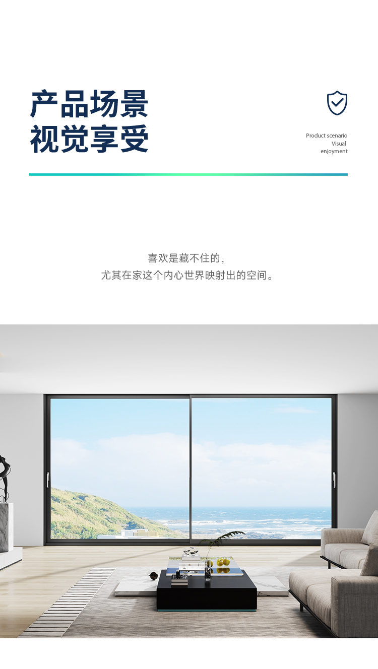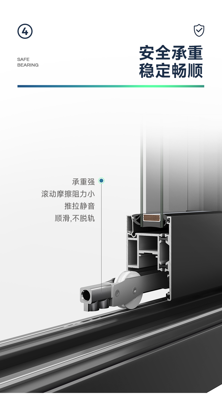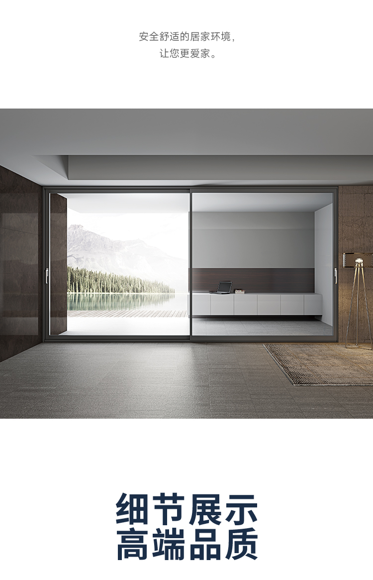 超國標,超安全,可設計超大開啟扇,超大視野; 超安全門扇防倒設計,預防脫軌、脫扇危險; 強化扶手,推拉更方便,抗風壓性能更強; 超安全重型滑輪,承重300KG; 超安全防撬鎖點設計,更安全; 嵌入式密封結構,搭配多重密封設計,更隔音; 海島防水排水設計,無懼暴風雨。