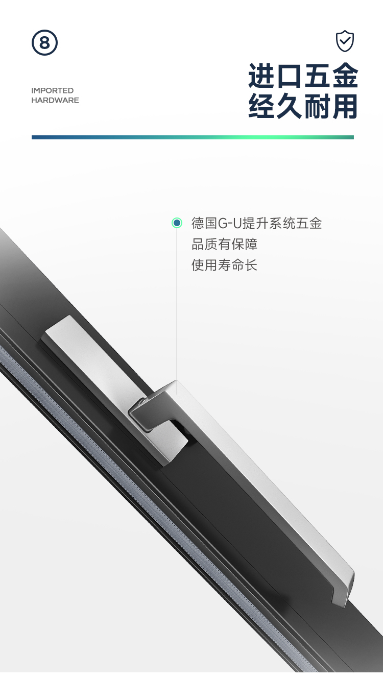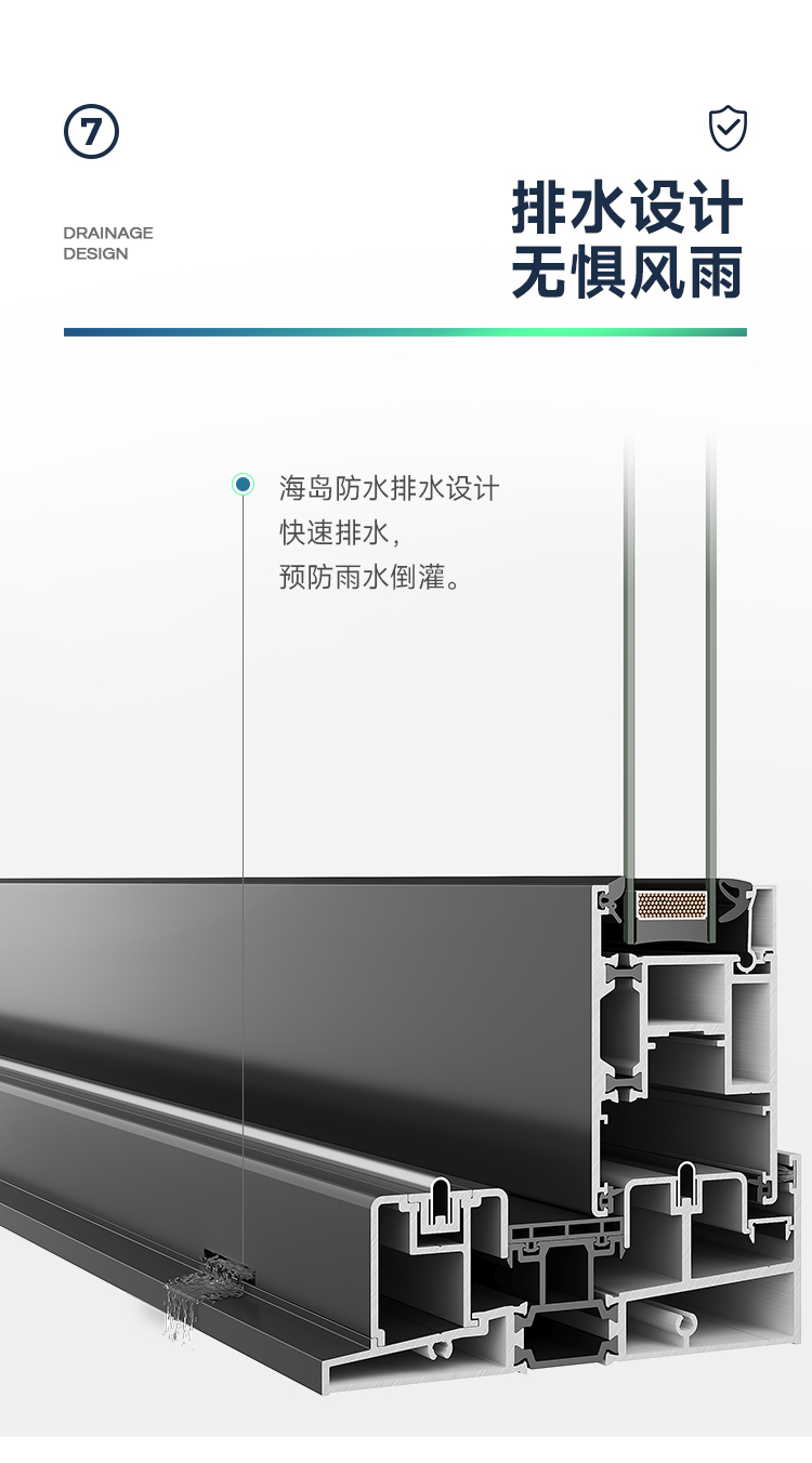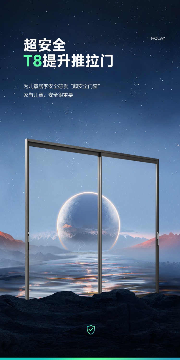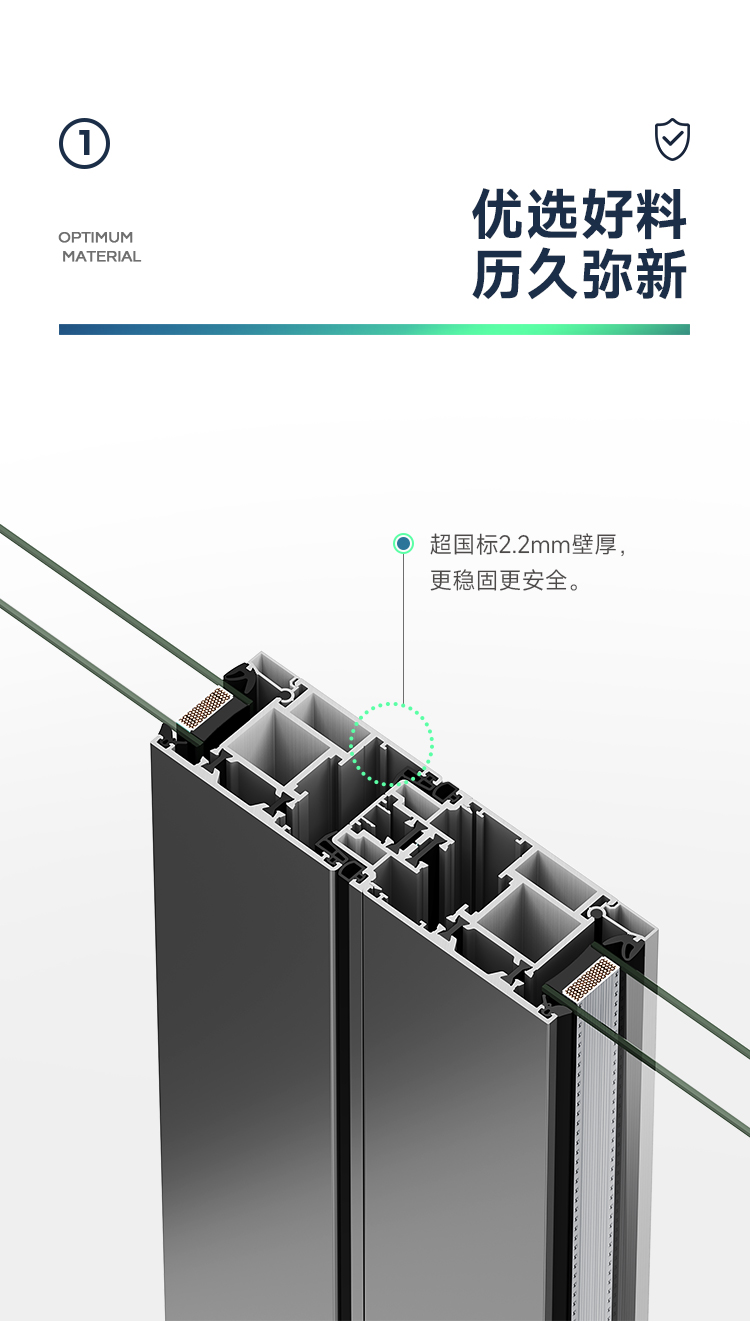 超國標,超安全,可設計超大開啟扇,超大視野; 超安全門扇防倒設計,預防脫軌、脫扇危險; 強化扶手,推拉更方便,抗風壓性能更強; 超安全重型滑輪,承重300KG; 超安全防撬鎖點設計,更安全; 嵌入式密封結構,搭配多重密封設計,更隔音; 海島防水排水設計,無懼暴風雨。
