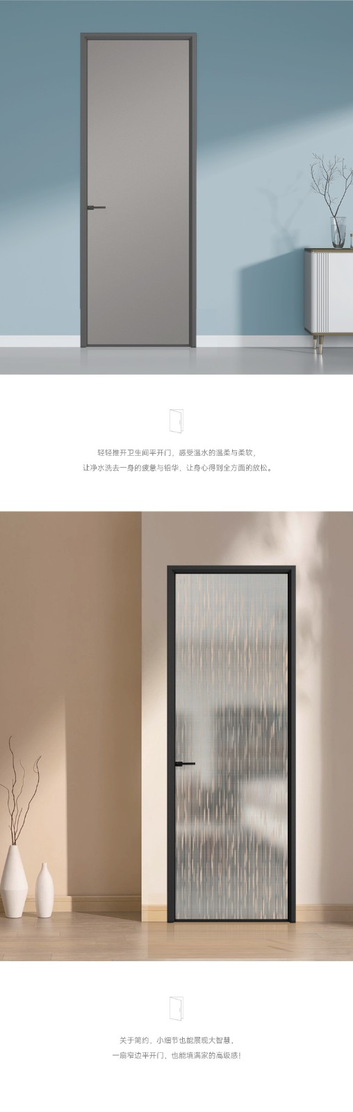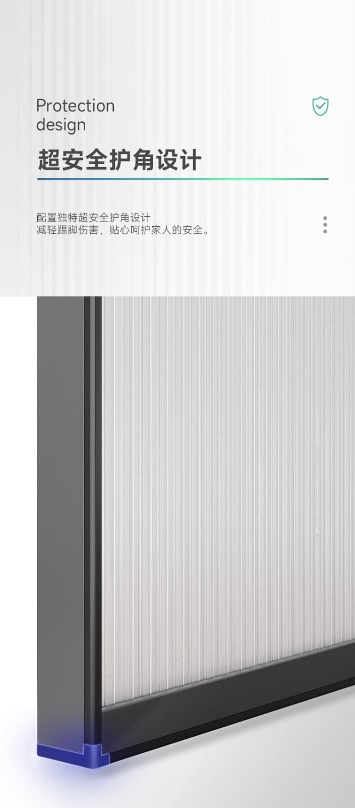 超安全預防夾手設計,避免夾手傷害 超安全護角,減輕踢腳傷害 隱藏鎖片,減少碰撞劃傷 隱藏式天地合頁,承重更強,避免掉扇傷人; 超國標,超安全3.0mm壁厚 超安全100%強化玻璃,防止破碎劃傷 極窄,極簡,極美,可做典雅黑、星空灰、象牙白、摩卡 多種工藝玻璃可選,滿足您不同的風格需求