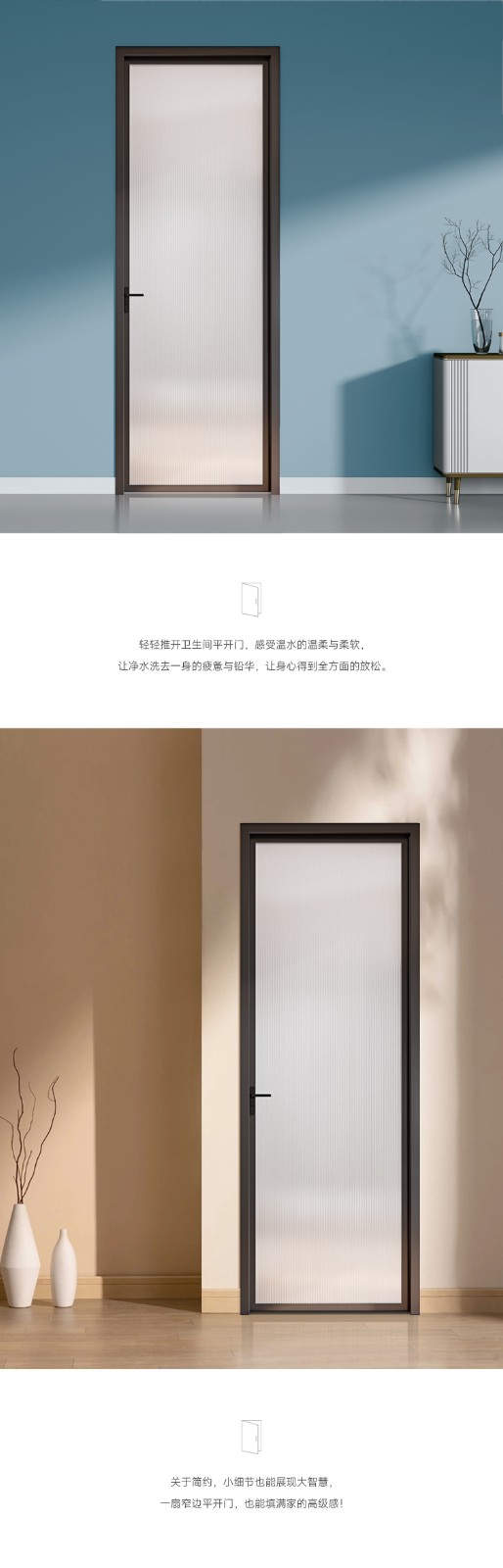 超安全預防夾手設計,兒童使用更安全; 超安全護角,減輕踢腳傷害; 超安全鋼軸合頁,預防掉扇傷人; 超安全100%強化玻璃,預防玻璃破碎劃傷; 磁吸鎖芯,減少碰撞劃傷; 多種工藝玻璃可選,滿足您不同的風格需求。