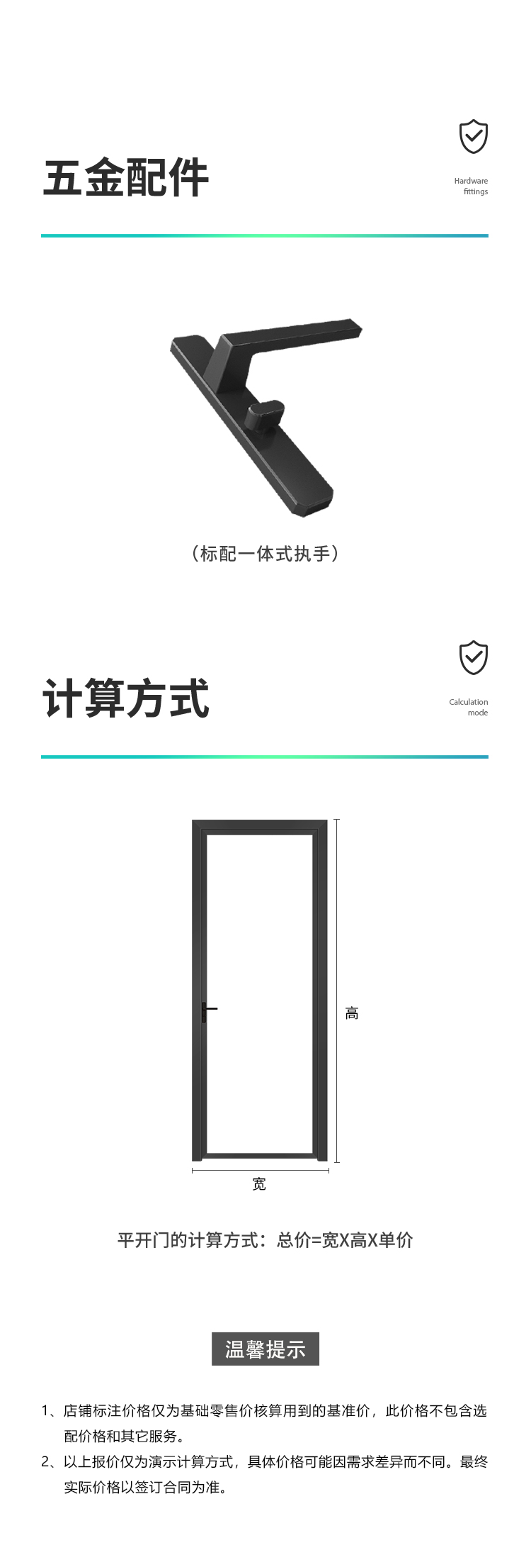 特殊配置:(如雙包外框墻厚超出180mm,更換鎖具、定制顏色、圓頭、門連窗、換氣口等),需另外計價; 單扇門不足1.5㎡按1.5㎡; 以上單價不含運輸與安裝費、稅費; 雙包外框墻厚超過180mm的價格另計; 部分偏遠地區因物流原因價格上浮10%為合理現象。