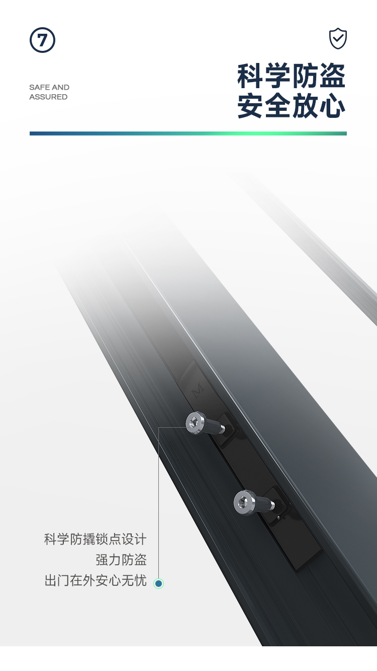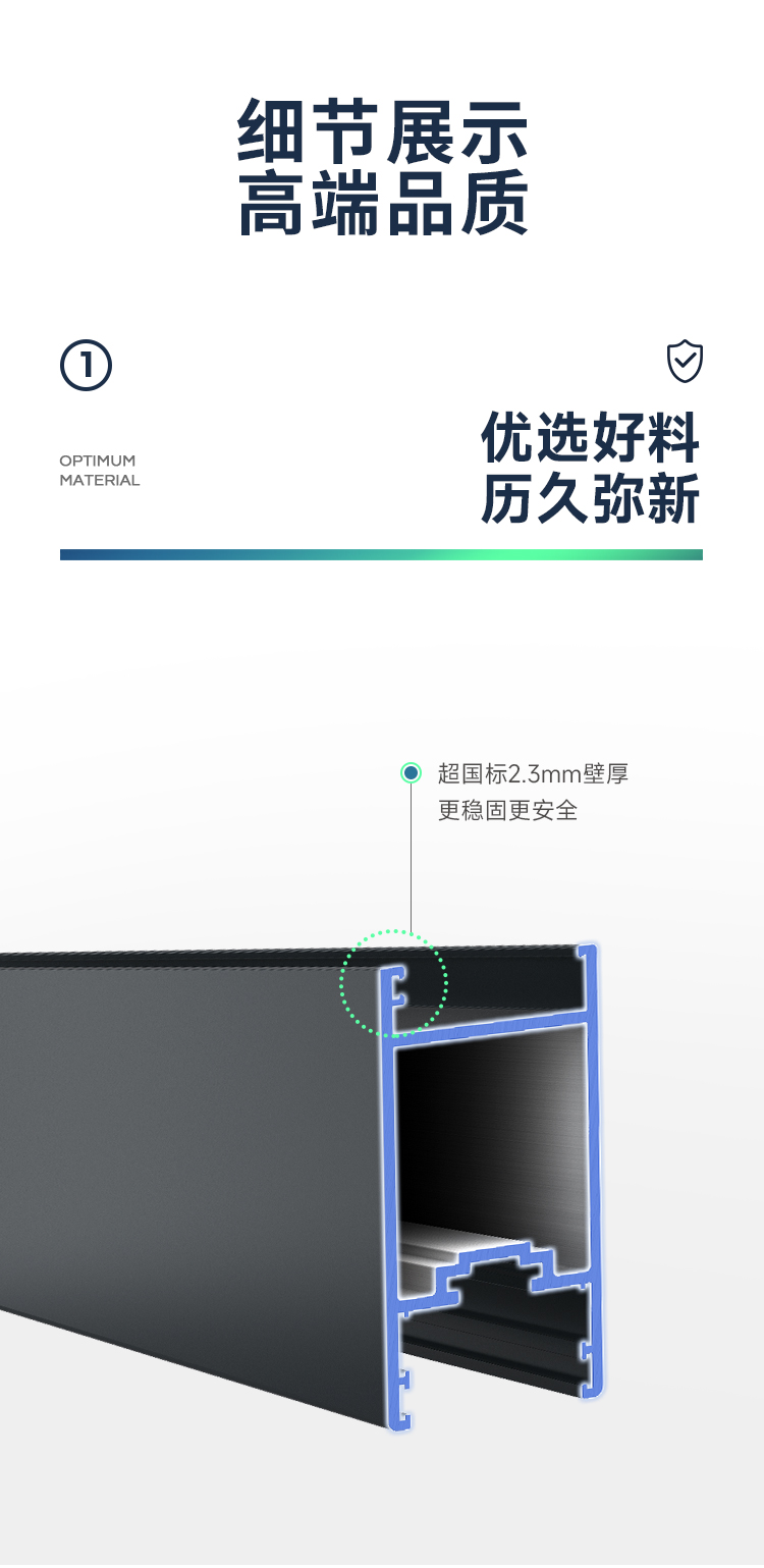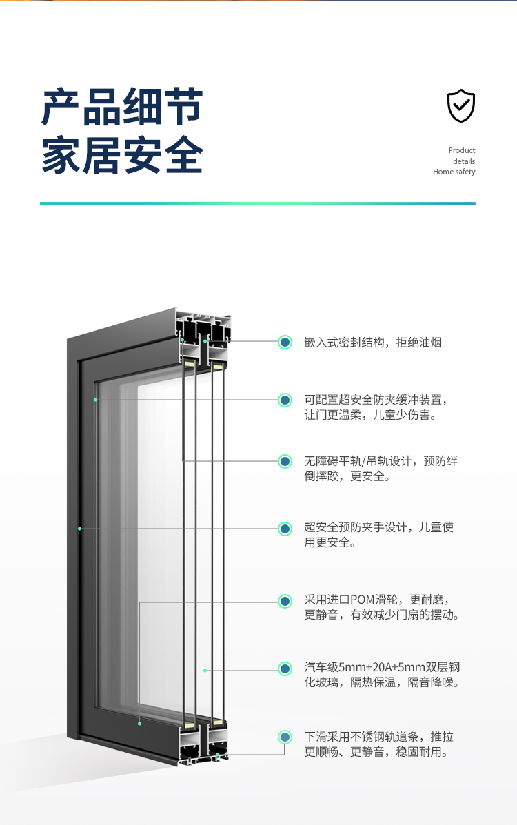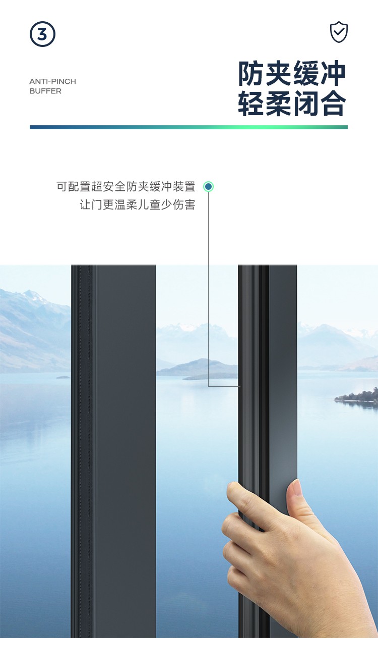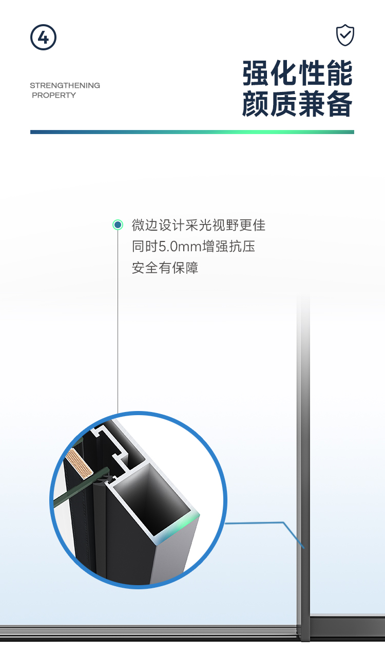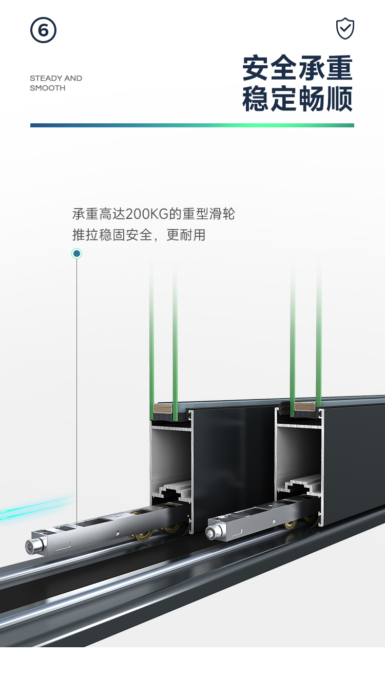 新國標2.3mm壁厚;微邊大視野,5.0mm增強抗壓; 大中空鋼化玻璃,采用雙膠條減震密封設計,隔音效果更好; 超安全重型滑輪,承重200KG; 超安全防撬鎖點設計,更安全; 可配置超安全防夾緩沖裝置,讓門更溫柔,兒童少傷害; 防水軌道、無障礙平軌,滿足室內外的不同需求; 磁懸浮升級款,盡享智慧生活。