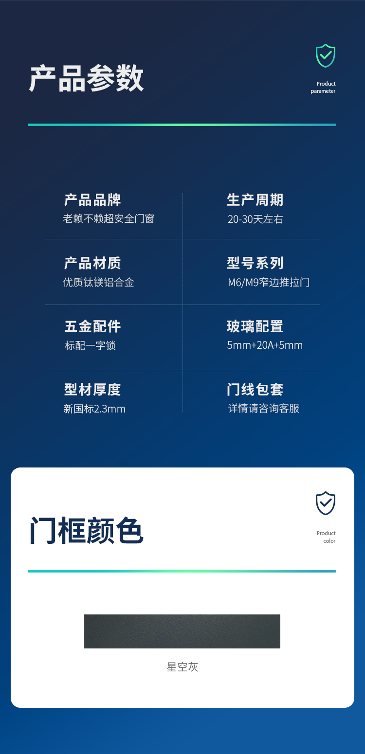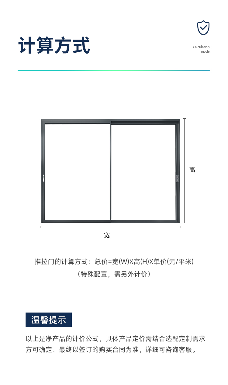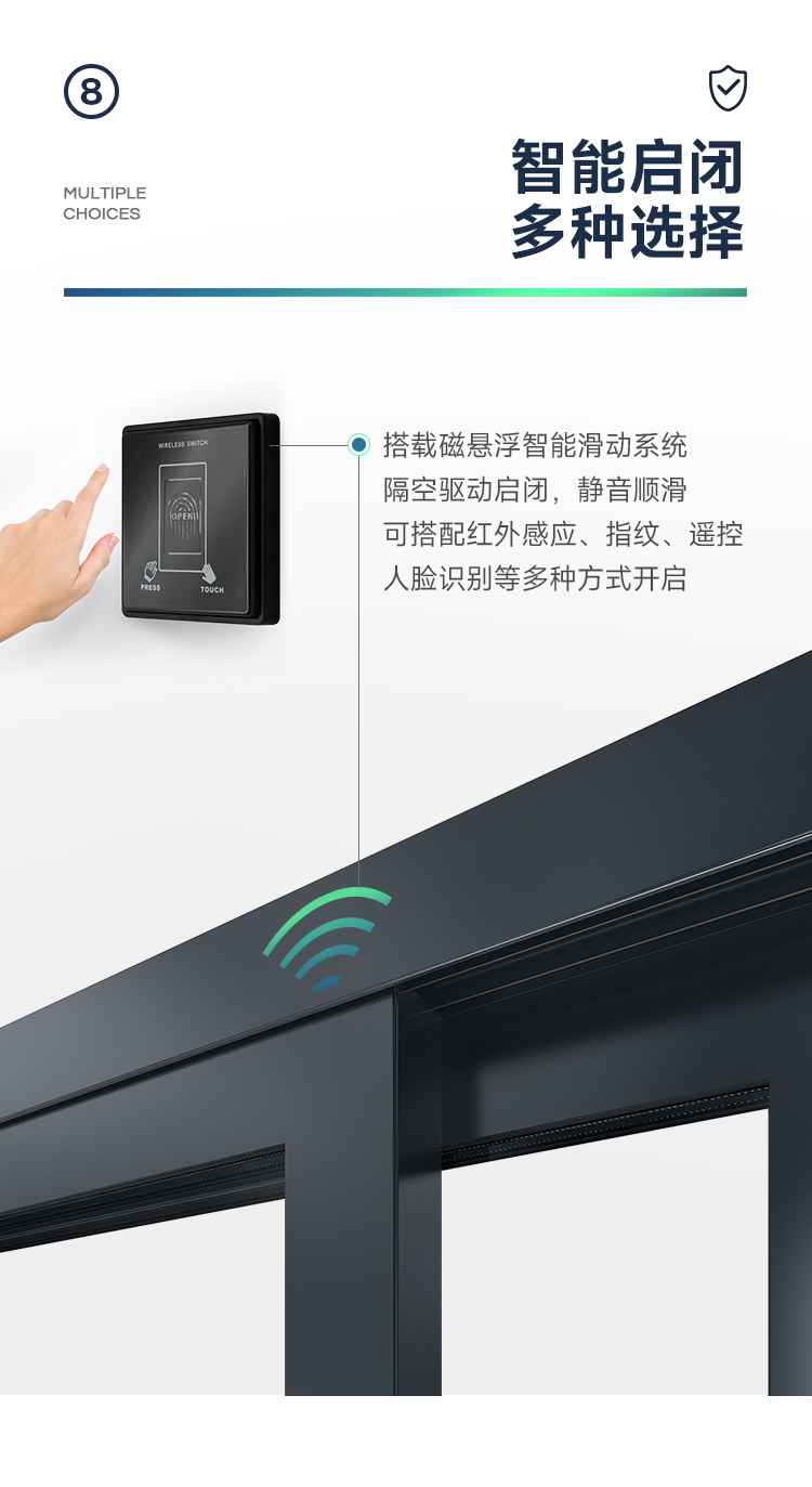 新國標 2.3mm壁厚;微邊大視野,5.0mm增強抗壓; 大中空鋼化玻璃,采用雙膠條減震密封設計,隔音效果更好; 超安全重型滑輪,承重200KG; 超安全防撬鎖點設計,更安全; 可配置超安全防夾緩沖裝置,讓門更溫柔,兒童少傷害; 防水軌道、無障礙平軌,滿足室內外的不同需求; 磁懸浮升級款,盡享智慧生活。